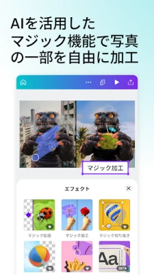 アイデアを形にする喜びを、Canvaが届けます。グラフィックデザインの初心者からプロフェッショナルまで、誰もが驚くほど簡単に、そして直感的にクリエイティブな表現を実現できるオールインワンツールです。写真編集、動画制作、目を引くコラージュ、そしてブランディングを支えるロゴデザインまで、Canva一つであらゆるビジュアルニーズに応えます。Canvaに組み込まれた先進のAI機能は、まるで魔法のようにあなたの創造力を解き放ちます。画像を基にデザインを提案する「マジックデザイン」、既存の画像を自在に加工する「マジック加工」、多言語対応の「AI自動翻訳」、そして不要な要素を瞬時に消し去る「マジック消しゴム」が、あなたのアイデアを鮮やかな形に変えるお手伝いをします。