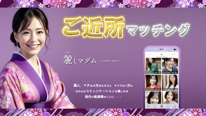 「一度きりの人生、より豊かに輝かせたい」そう願う、知性と経験を重ねた皆様へ。「麗しマダム」は、日々の喧騒から離れ、心落ち着く環境で新たな交流を求める大人のための特別な空間です。一般的な若者向けアプリの雰囲気に馴染めなかった方、または同世代はもちろん、異なる世代とも多様な話題で深く語り合いたいと願う方はいませんか。これといった趣味がなくても、写真を送り合いながら日常を分かち合う喜びや、普段は接点のない方々との新鮮な発見が、きっとあなたの毎日を彩ります。