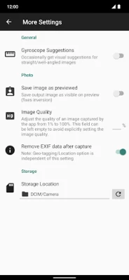 本アプリは、単なる記録を超えた高品質なイメージングを提供します。通常はシーン全体の自動フォーカス、自動露出、自動ホワイトバランスが連続的に機能し、常に最適な状態を保ちます。特定の部分にタップすれば、その点に合わせたフォーカスと露出へと賢く切り替わり、繊細な表現を可能にします。左側の露出補正スライダーを使えば、シャッタースピード、絞り、ISOを自動調整しつつ、光のニュアンスを自在にコントロール。撮影した画像や動画は内蔵のギャラリーとビデオプレイヤーで即座に確認でき、編集が必要な場合は外部エディターへスムーズに連携します。さらに、プライバシー保護にも配慮し、撮影画像のEXIFメタデータは初期設定で自動的に削除され、必要な情報のみが残されるよう設計されています。