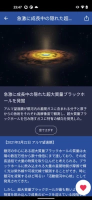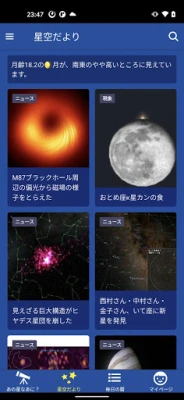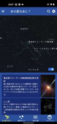 「星空ナビ」は、現在の星空の様子から、絶景、天文現象、神秘的な宇宙の話題まで、星の魅力と不思議を発見できるアプリです。いつでもどこでも、満点の星空の世界へ誘います。