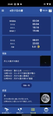 日々の忙しさの中でも、ふと宇宙に思いを馳せるひとときを。「星空ナビ」があれば、刻々と変化する夜空の表情や、宇宙の深淵に隠された秘密をいつでも身近に感じられます。まるでパーソナルな天文台を持っているかのように、指先一つで星々の輝きや宇宙の鼓動に触れる喜びを体験してください。宇宙の魅力を探求し続けるAstroArtsが贈る「星空ナビ」で、夜空の感動を毎日の生活に取り入れ、知的好奇心を刺激する日々を送りませんか。